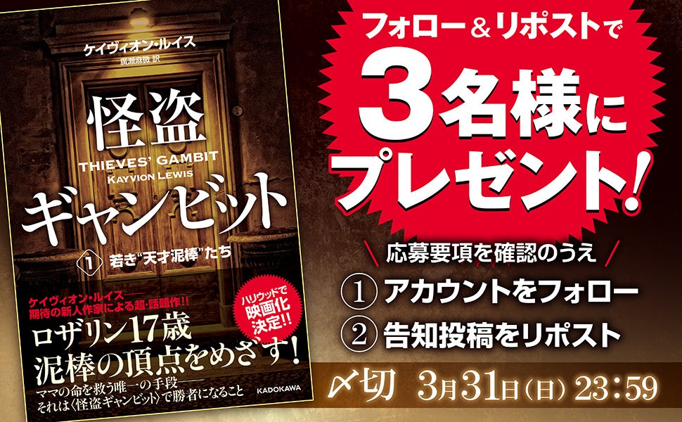 『怪盗ギャンビット1』発売記念プレゼントキャンペーン【2024春】 <賞品> 『怪盗ギャンビット1 若き“天才泥棒”たち』を抽選で3名様に <応募しめ切り> 2024年3月31日(日) 23:59 リポスト分まで <応募方法> 注意事項を確認のうえ、 1 X(Twitter)のKADOKAWA翻訳チーム公式アカウント「@kadokawahonyaku」をフォロー 2 当キャンペーンの告知投稿をリポスト(RT)で完了! <当選発表> 当選者へのみ、2024年4月3日頃、X(Twitter)のDM(ダイレクトメッセージ)にて「@kadokawahonyaku」よりお知らせします。 ※あらかじめDMを受け取れるよう設定してください。 ※当選の場合、2024年4月10日(水)までに賞品送付先を専用フォームにてご登録いただく必要があります。かならず期日までにDMをご確認ください。 ▼注意事項 ※あらかじめご了承のうえご応募ください。 ◆応募には、X (Twitter)への登録(無料)が必要です。 ◆当選はおひとりにつき1口までとなります。 ◆以下の場合は、応募をお受けできません。 ・非公開アカウントの場合 ・懸賞応募用アカウントやボット(bot)アカウントから応募した場合 ・当選発表以前に、応募投稿を削除した場合 ・当選発表以前に、公式アカウントのフォローを解除した場合 ・第三者の権利を侵害する内容および公序良俗に反する内容など、株式会社KADOKAWA(以下、弊社といいます)で不適切と判断した内容が含まれる場合 ◆応募に際し発生する通信料などは、お客様のご負担となります。 ◆賞品の発送は2024年4月下旬を予定しています。なお、発送先は日本国内に限ります。 ◆当選賞品を譲渡(転売、オークション出品含む)しないことが応募・当選の条件です。譲渡が明らかになった場合、当選は取り消され賞品をお返しいただくことがあります。 ◆当キャンペーンは、弊社が主催しています。X(Twitter)およびX Corp.とは関係ありません。 ◆X(Twitter)および関連ツールの動作等の不測の障害により、当キャンペーンを予告なく変更・中止させていただく場合があります。 ◆応募に際しご提供いただいた個人情報は、弊社のプライバシーポリシー(https://ir.kadokawa.co.jp/company/privacy_policy.php)の定めるところにより取り扱わせていただきます。 ◆応募に際しお客様に生じた損害等につきましては、弊社に重過失のある場合を除き、弊社は一切賠償の責を負わないものとします。 <お問い合わせ> KADOKAWA カスタマーサポート https://wwws.kadokawa.co.jp/support/contact/ ※「怪盗ギャンビット1発売キャンペーンについて」とご明記ください。 ※サポートは日本国内に限ります。
