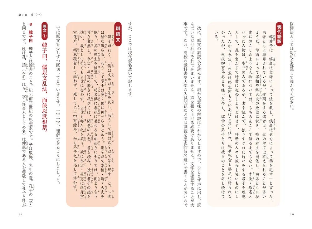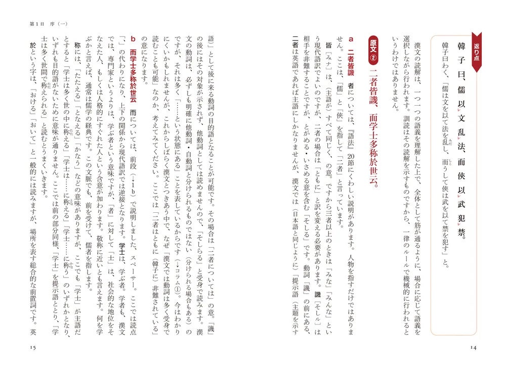 「原文」を細かく区切りながら、原文に記されている一つ一つの漢字が何を意味しているのかを詳解し、ときには、ある一文字の解釈について立ち止まってじっくり考えることを通じて、漢文読解の奥深さに触れていきます。