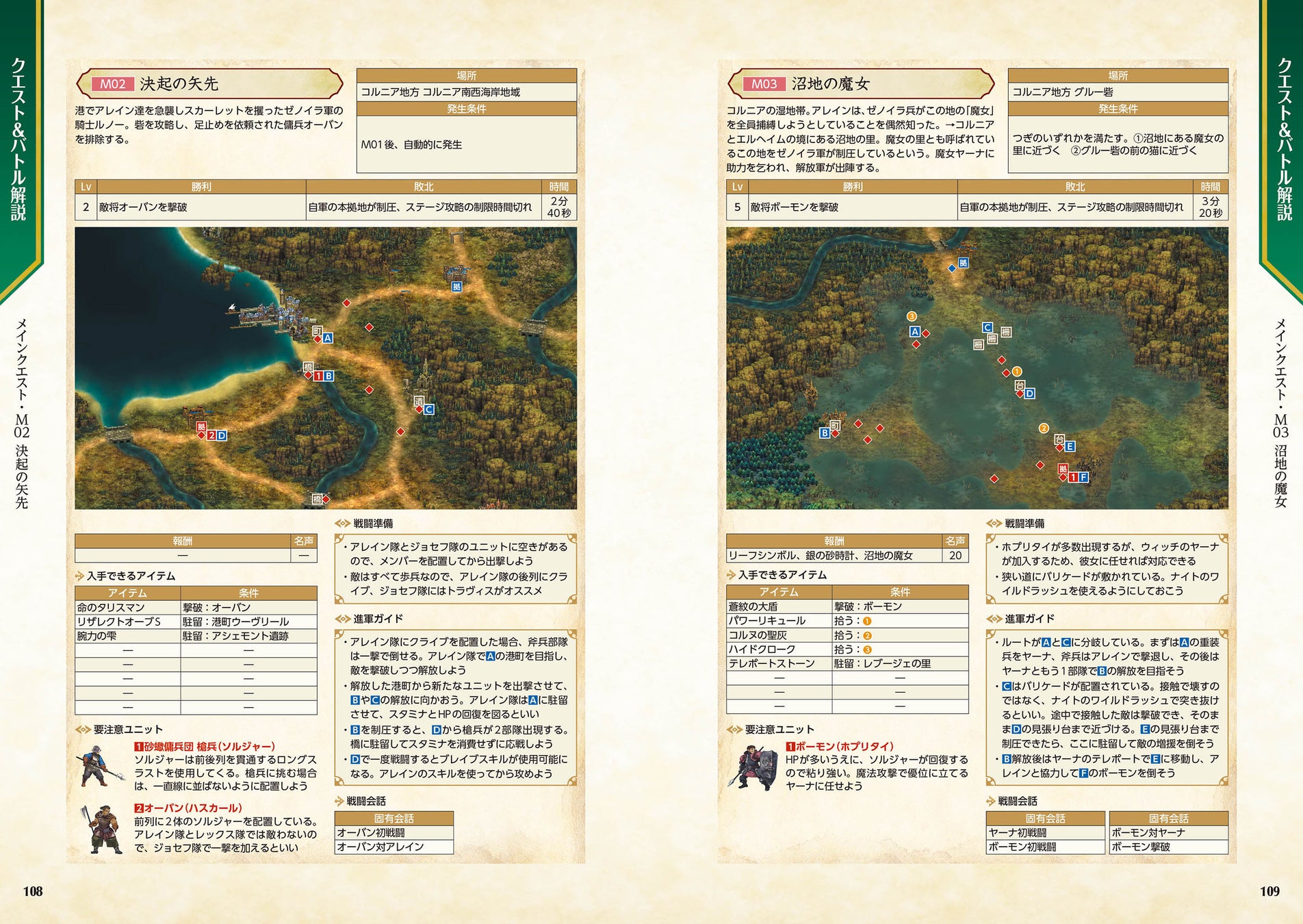 150を超える多彩なクエストの発生条件とクリア条件を掲載。バトルが起きるクエストは、ステージマップとともに進軍のポイントを解説