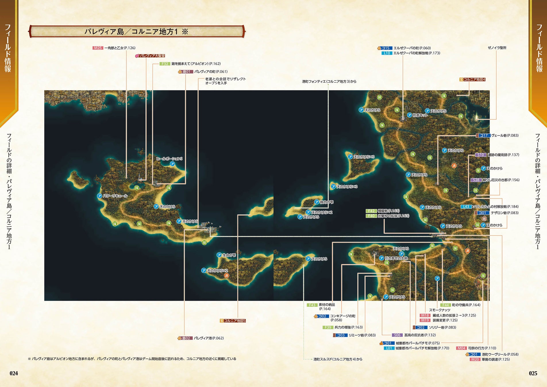 5つの地方に分かれた広大なフィールドのマップ情報。町や砦の場所、クエスト発生地点のほか、アイテムの入手場所や採取ポイントも掲載