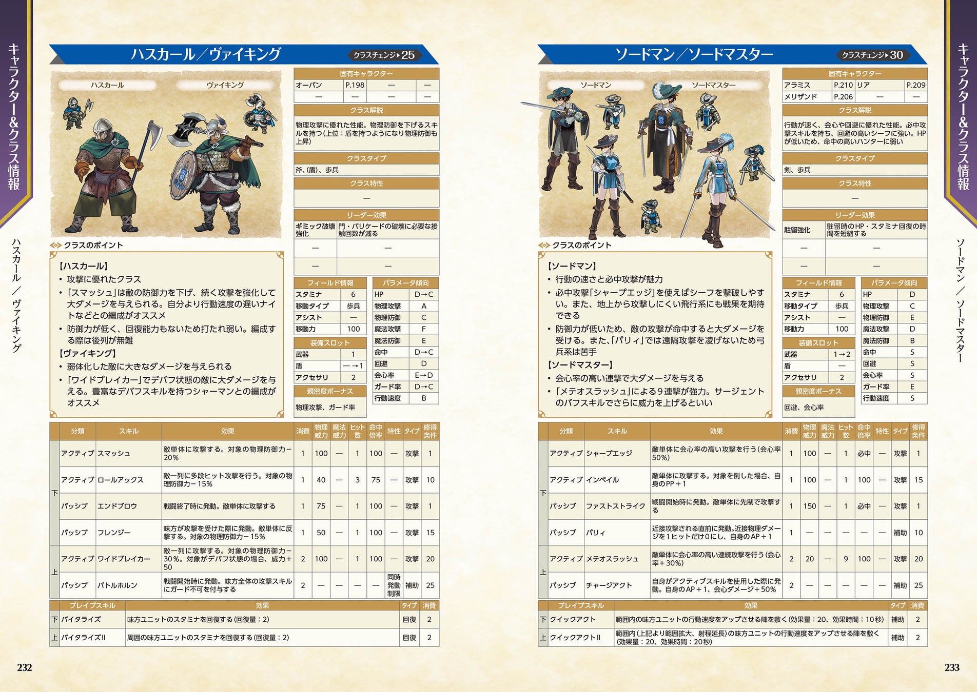 主人公のアレインを始め、60名以上のキャラクター全員を仲間にするための条件を公開。クラスデータでは、特性やパラメータ、スキルなど、ユニット編成に欠かせない情報を掲載