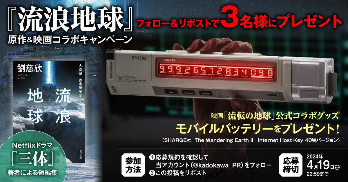 『流転の地球ー太陽系脱出計画ー』をモチーフにした近未来SFデザインのモバイルバッテリー「Internet Host Key」を、KADOKAWA宣伝局公式アカウントをフォロー&リポストした方の中から抽選で3名様に贈ります。