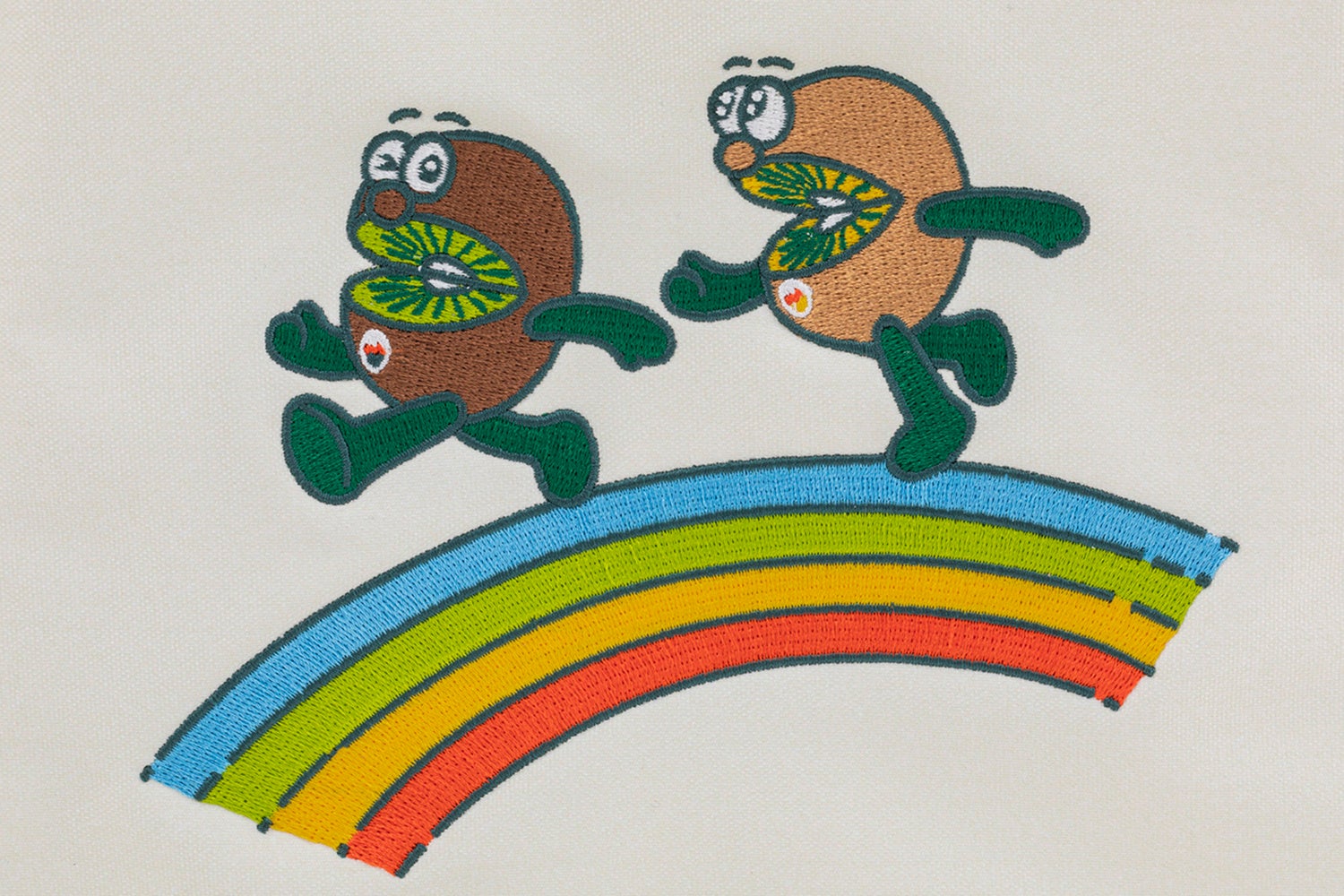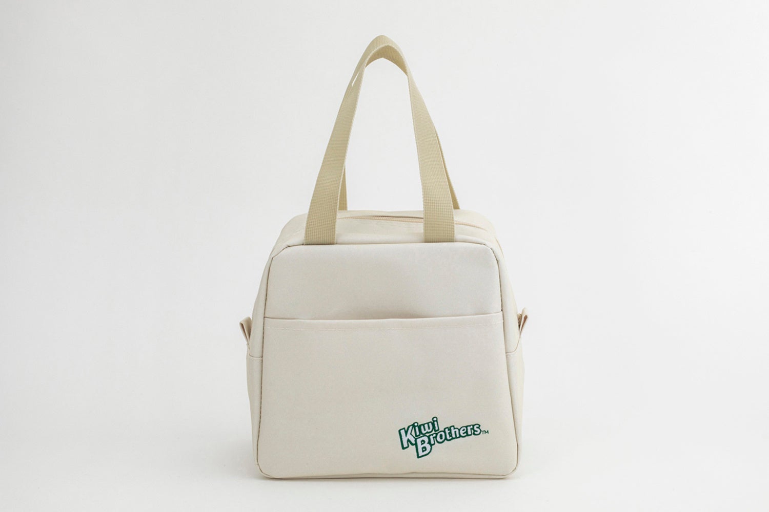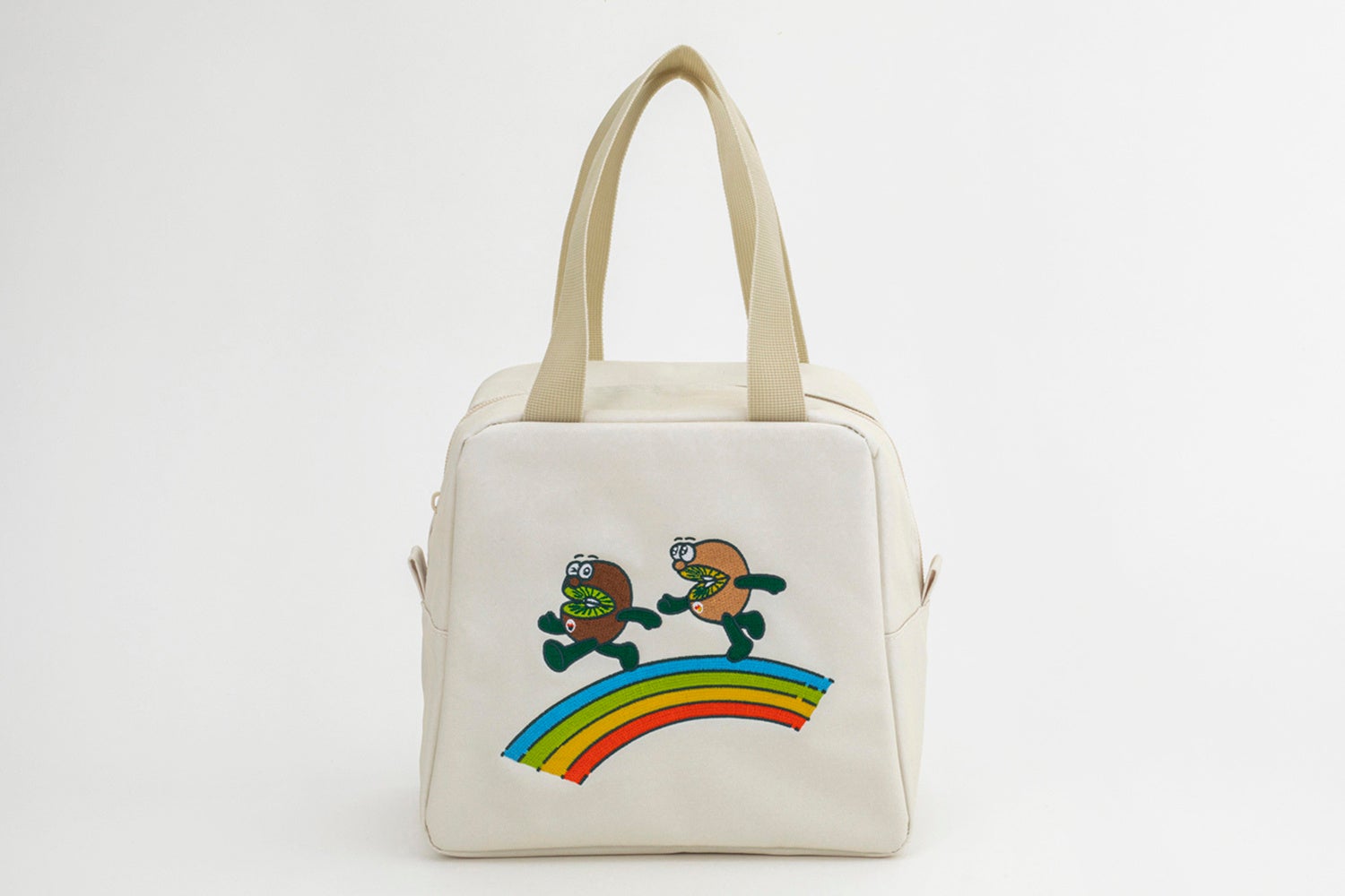 キウイブラザーズの楽しげな刺繍が大きくあしらわれた保冷ランチバッグ