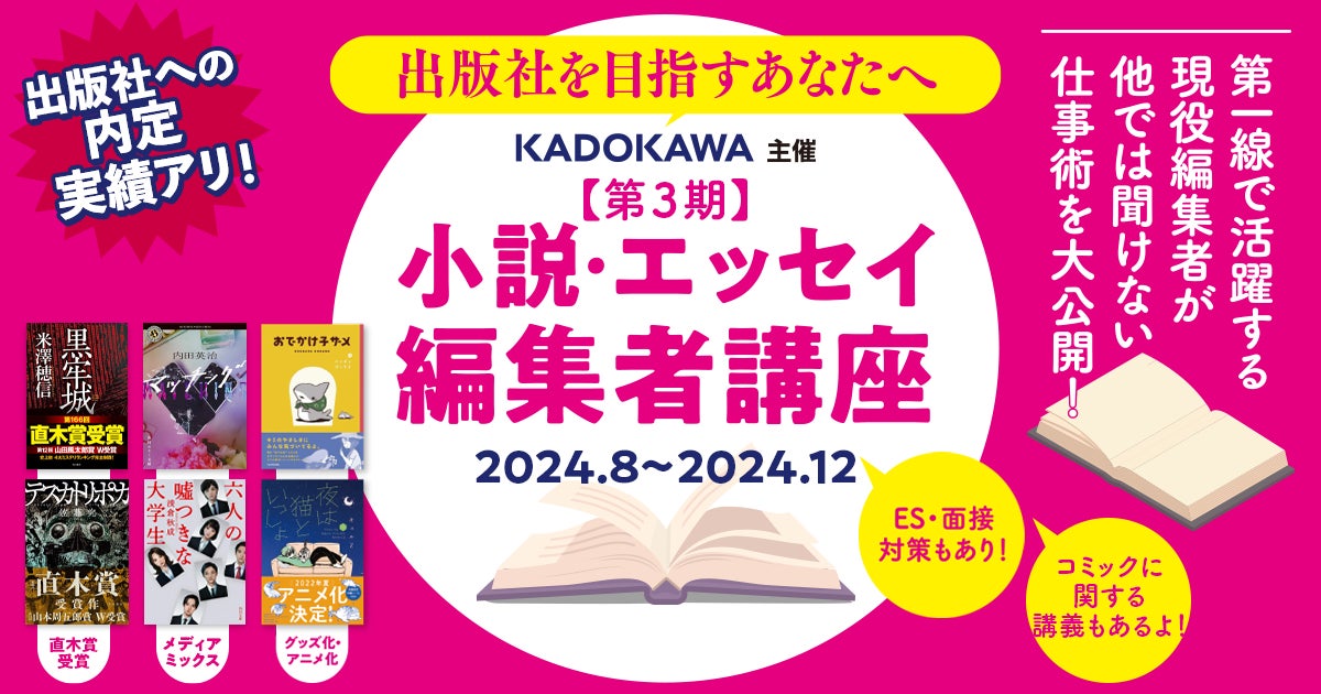 株式会社KADOKAWA(本社:東京都千代田区、取締役 代表執行役社長 CEO:夏野剛)は、昨年度に引き続き、出版社を目指す方を対象とした「小説・エッセイ編集者講座(第3期)」を2024年8月30日(金)より開催します。小説やコミックエッセイなど様々なジャンルの第一線で活躍する書籍編集者が出版業界の裏側や仕事術を大公開! さらに、面接官をつとめた経験のある社員が就活で必須のESの書き方や面接のポイントをレクチャーします。
