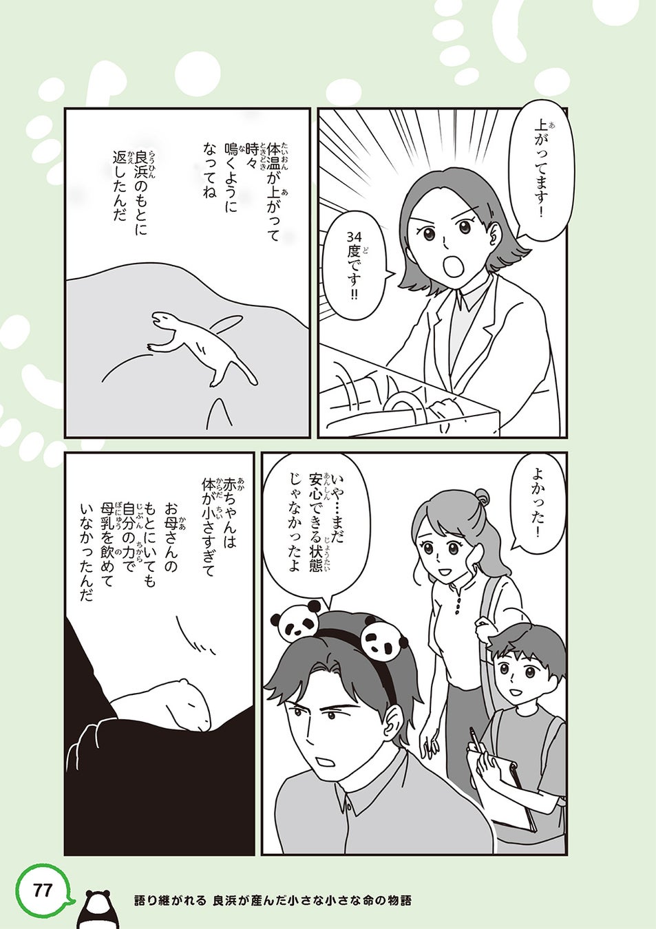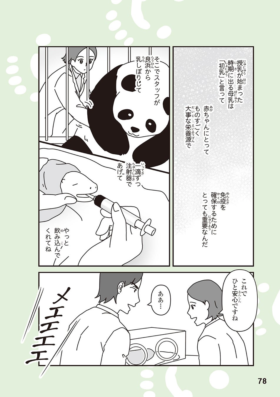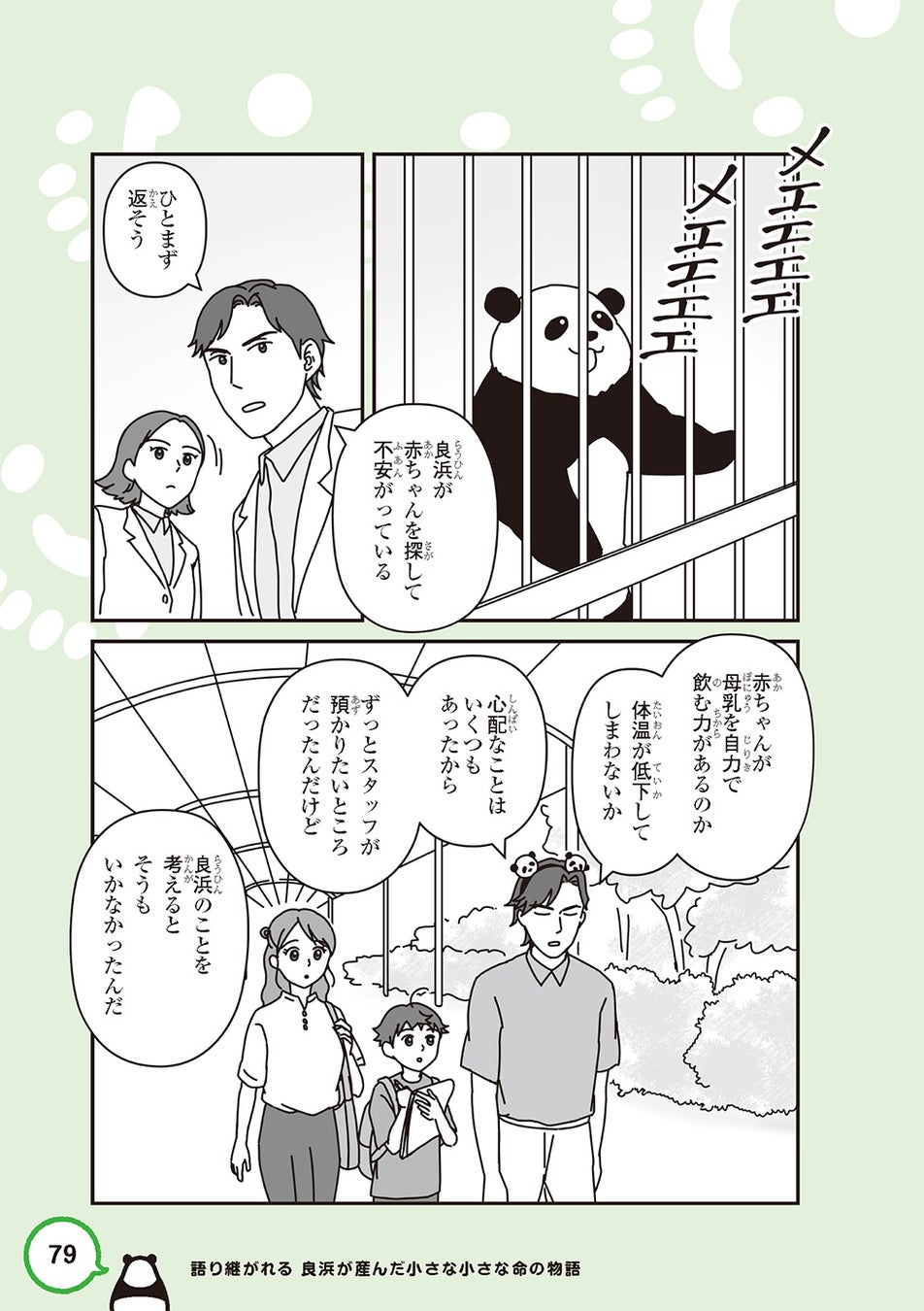 ほかにも、あまり知られていない良浜の子育てをたっぷり紹介。赤ちゃんの体温が安定する生後1か月くらいまでは、赤ちゃんを24時間抱っこして温めたり、かと思えば、赤ちゃんに授乳をすると餌をもらえるため、授乳中にスタッフへ視線を向け「頑張ってます」とアピールしたり…。さらには、パンダの繁殖に尽力するスタッフの苦労や工夫も描かれます。パンダ好きの方はもちろん、興味のない方も思わず引き込まれるエピソードが満載です。