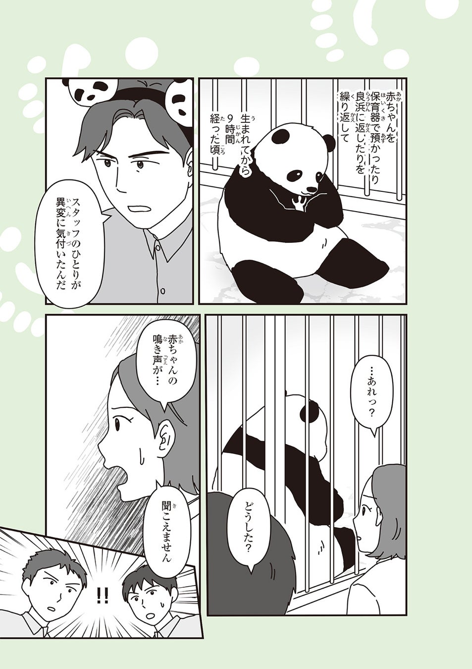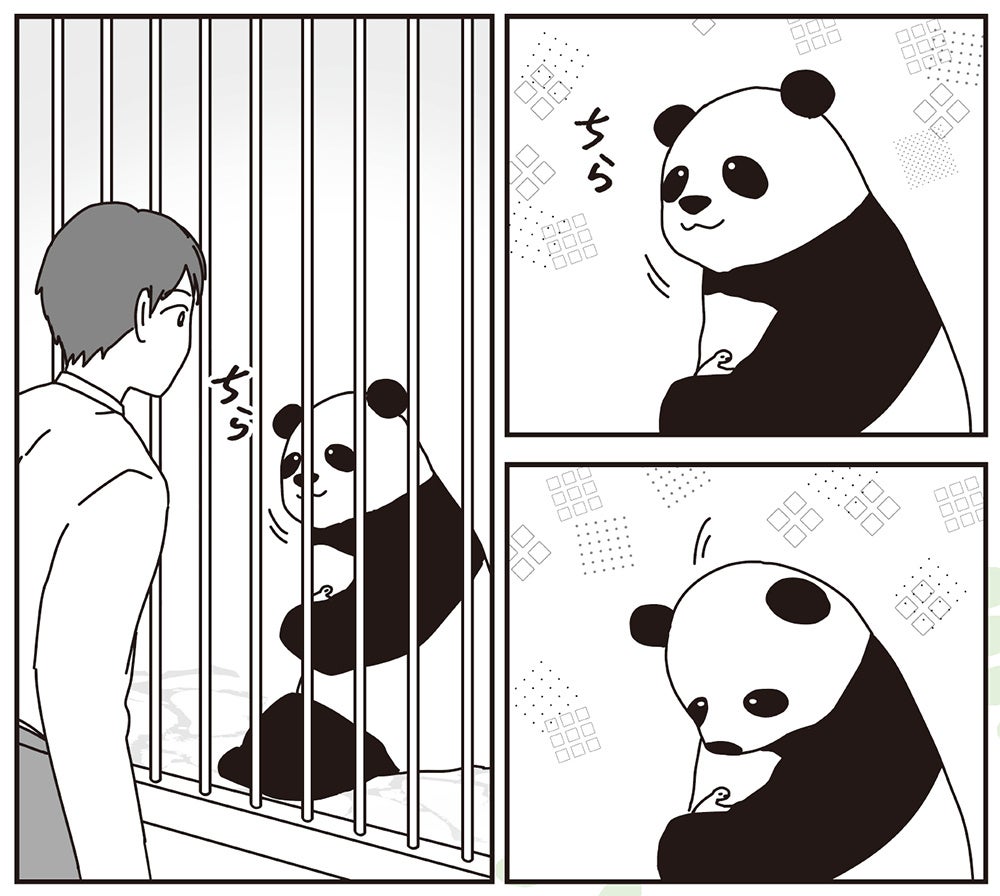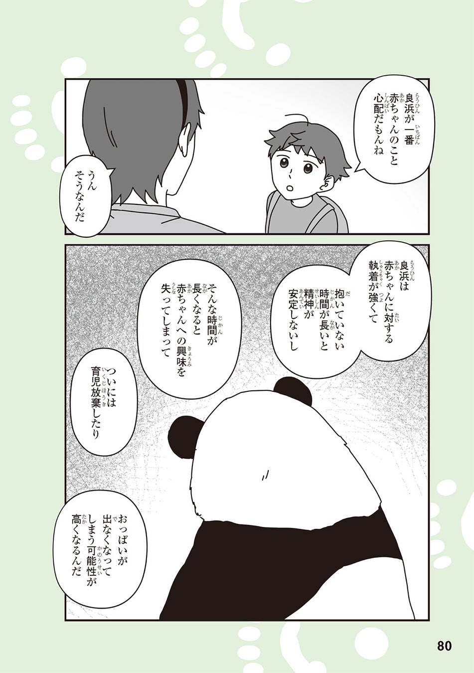 ほかにも、あまり知られていない良浜の子育てをたっぷり紹介。赤ちゃんの体温が安定する生後1か月くらいまでは、赤ちゃんを24時間抱っこして温めたり、かと思えば、赤ちゃんに授乳をすると餌をもらえるため、授乳中にスタッフへ視線を向け「頑張ってます」とアピールしたり…。さらには、パンダの繁殖に尽力するスタッフの苦労や工夫も描かれます。パンダ好きの方はもちろん、興味のない方も思わず引き込まれるエピソードが満載です。