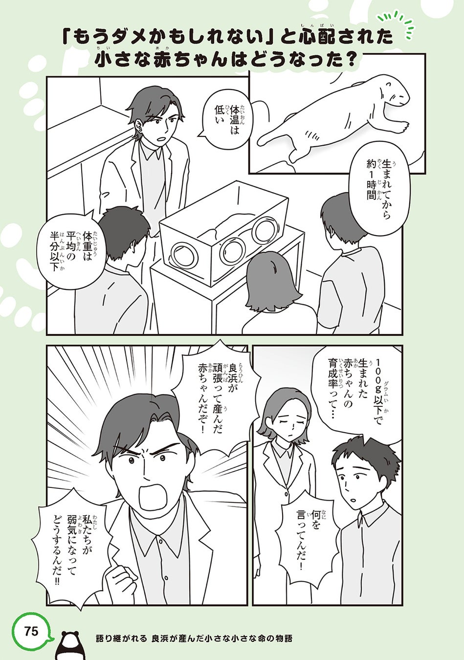 良浜の6度目の出産の時。通常パンダの出生直後の体重は100~200gのところ、この赤ちゃんはわずか75g。通常の体温は37℃ですが、31℃しかありません。生命の危機に瀕していました。