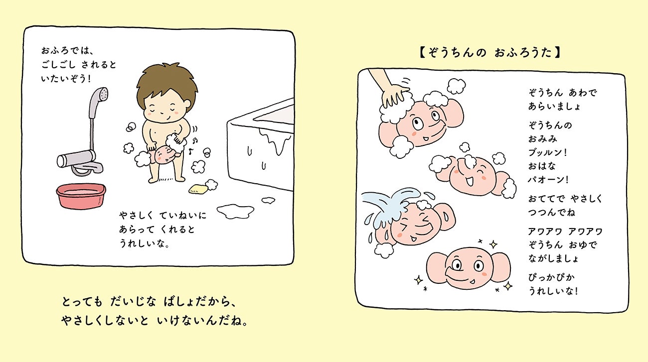 ↑おちんちんの正しい洗い方を紹介。オリジナルソング「ぞうちんのおふろうた」もKADOKAWA公式YouTubeで公開されるので、親子で楽しく歌いながら実践できる。