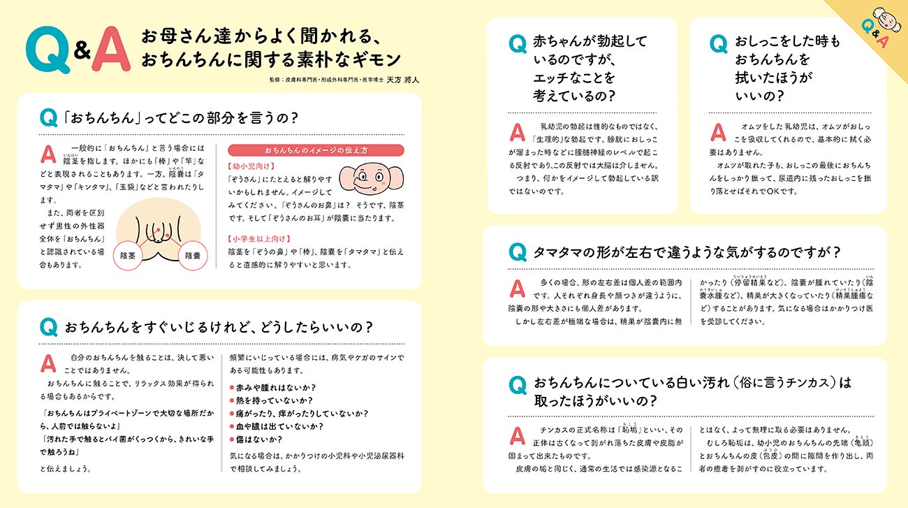 ↑巻末の大人向け「Q&A」では医師監修のもと、「おちんちんの皮は剥いていいの?」「なんで女の子にはおちんちんが付いていない?」といったさまざまな疑問にも答えている。お母さん、お父さんはもちろんのこと、幼児の成長に関わる医療従事者や保育現場のスタッフの方にも参考になる内容。