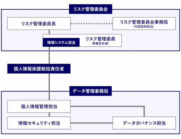 当社では、情報セキュリティ管理を推進する「データ管理事務局」を設置し、「個人情報保護総括責任者」のもと、取得した情報の取り扱いやデータ利活用の基本方針について、各種法令やプライバシーポリシーに準拠した取り扱いがなされているか議論・判断を行い、安全性の確保に努めています。